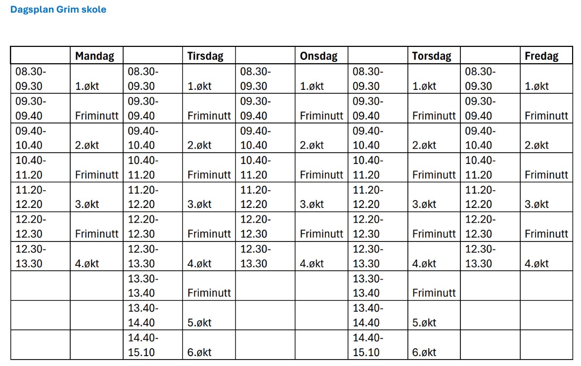 Dette skoleåret starter vi med helt ny timeplan. Her ser dere de nye tidene for timer/økter og friminutt: