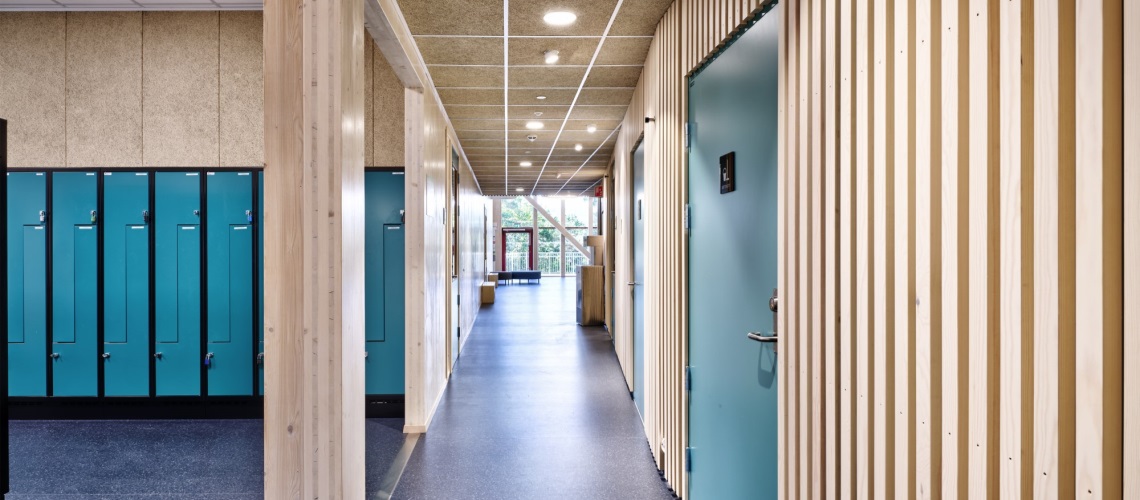 Det nesten 1500 kvadratmeter store tilbygget er bygget i massivtre. Dette var det første kommunale bygget som er bygget på denne måten.