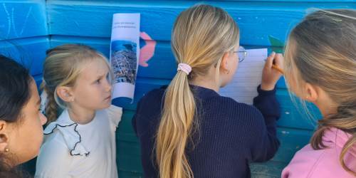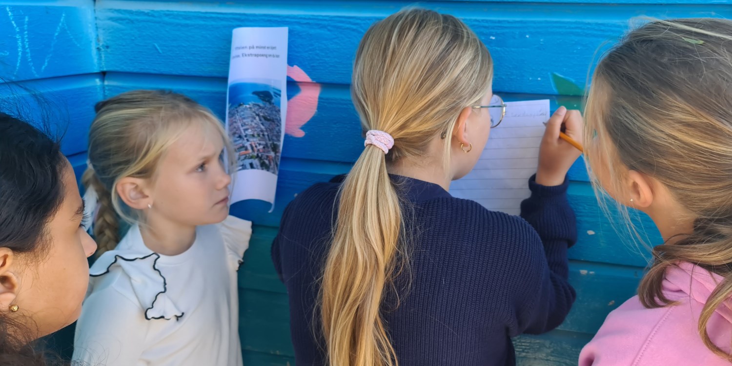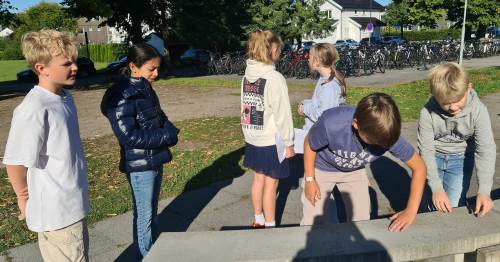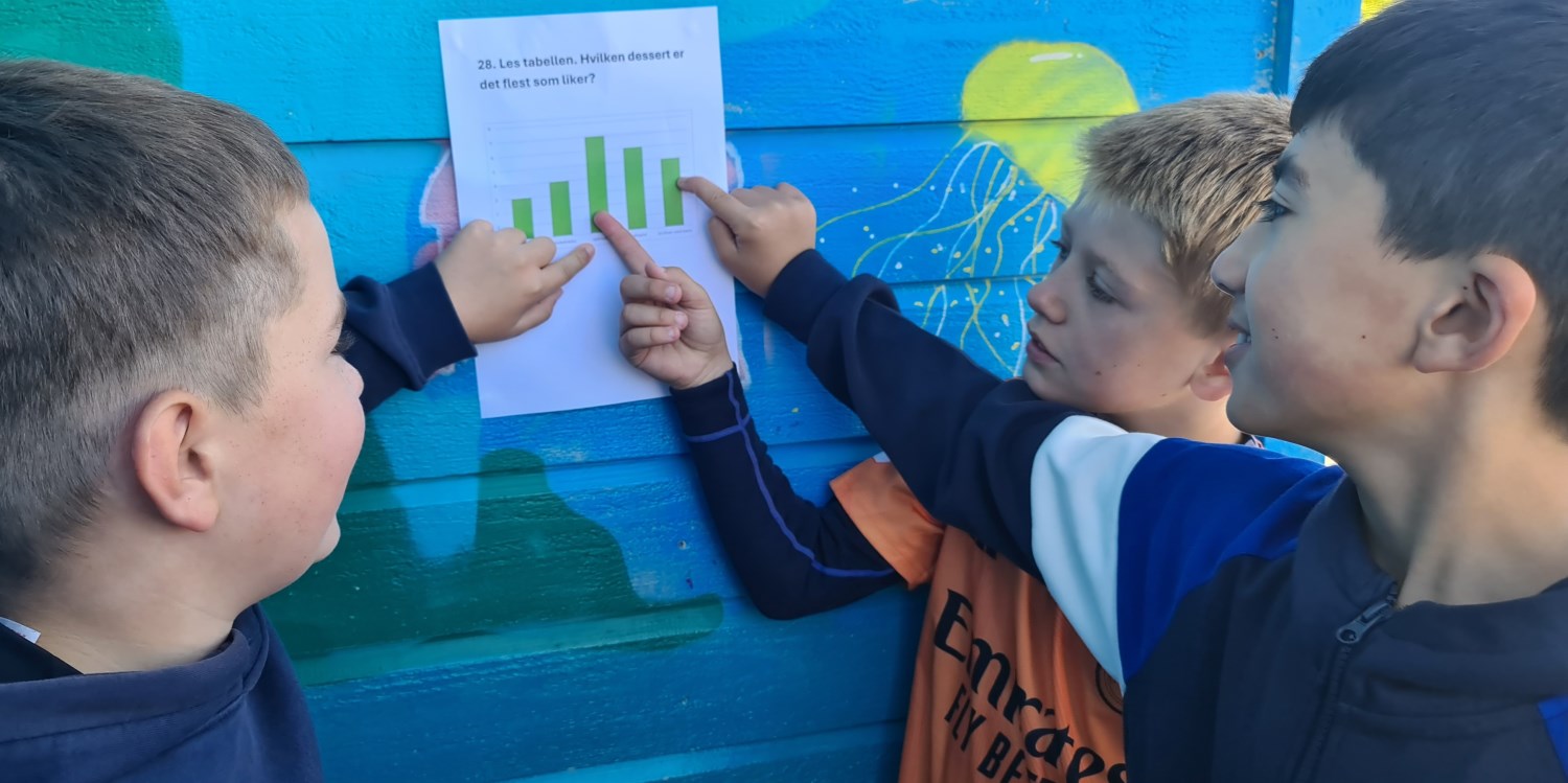 Torsdag gikk vi rundt i skolegården og fant poster med ulike spørsmål på som vi svarte på i mindre, samarbeidende grupper på tvers av trinnet