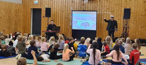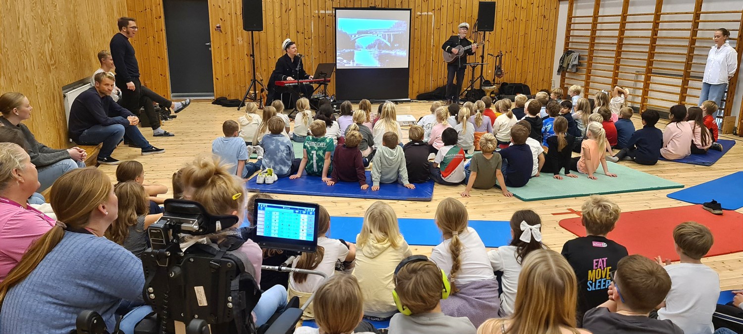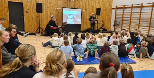 Rasmus Solem (keyboards, vokal, lydkulisser) og Tore Thomassen (gitar, vokal, ukulele, banjo) levendegjorde historien gjennom sanger, rim og regler, lyd og bilde, og elevene ble invitert til å synge med. "Dere på Lovisenlund skole er de beste til å synge", fikk elevene fra 3. og 5. trinn høre da jeg var tilstede og fotograferte under en av forestillingene satt opp for 1.-5. trinn.