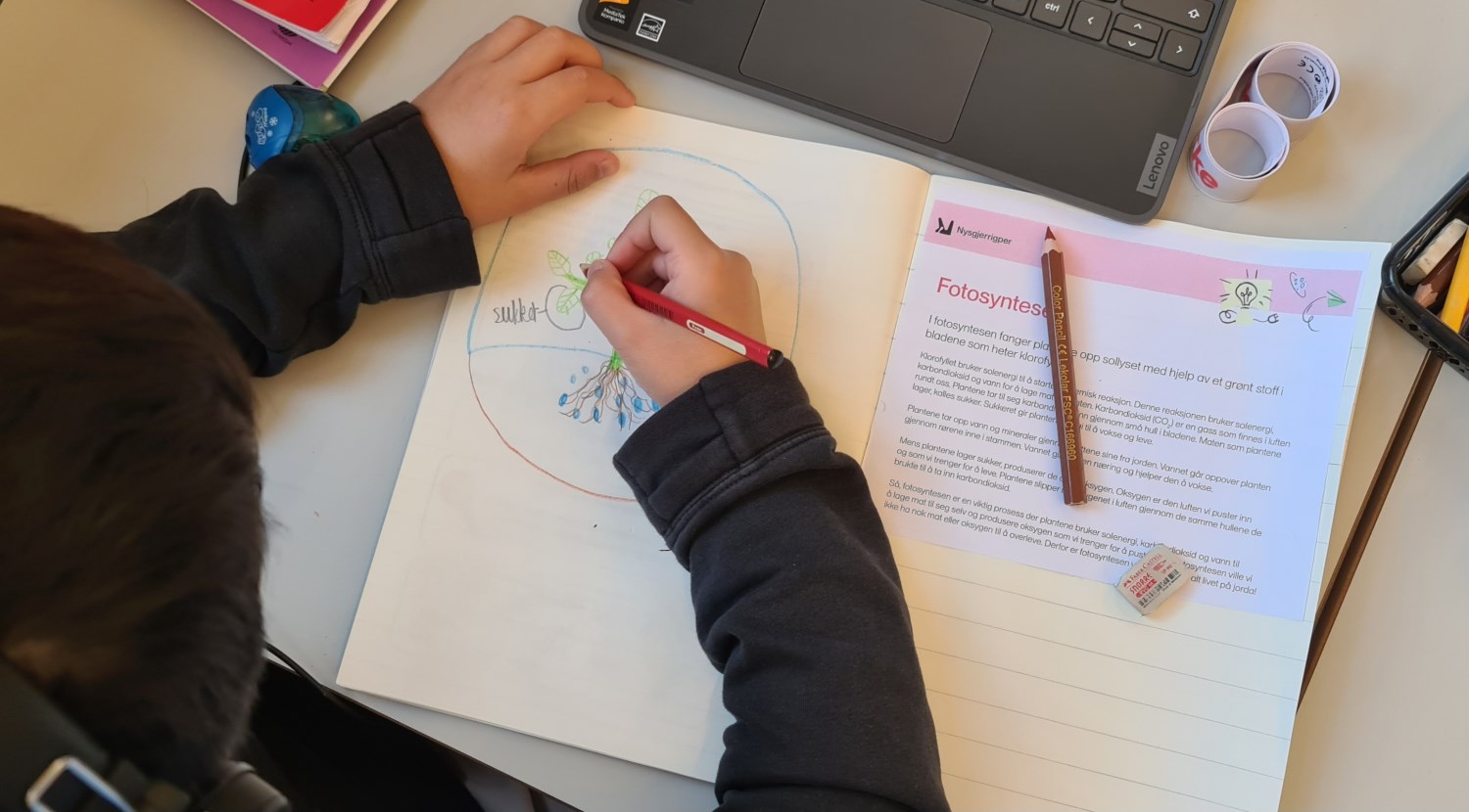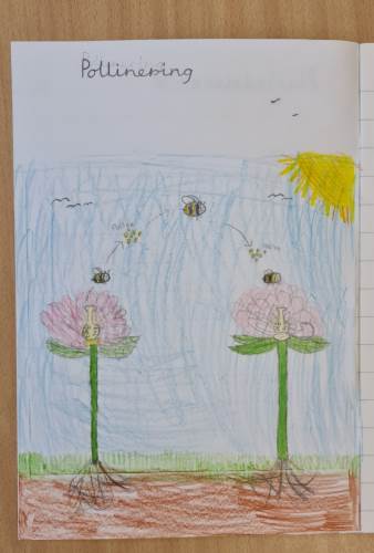 I egen arbeidsbok med egen forside har vi illustrert og skrevet det vi har lært. Det startet med blomstens ulike deler og pollinering. Hvordan og hvor bær utviklet seg fra blomst til bær ble undersøkt, og vi koste oss med bær og vaniljesaus; Naturen gir og vi får.
