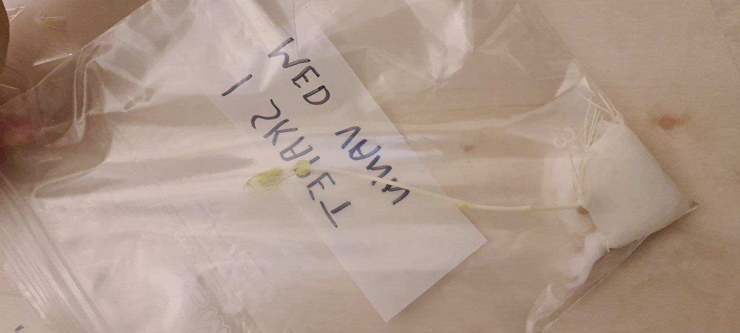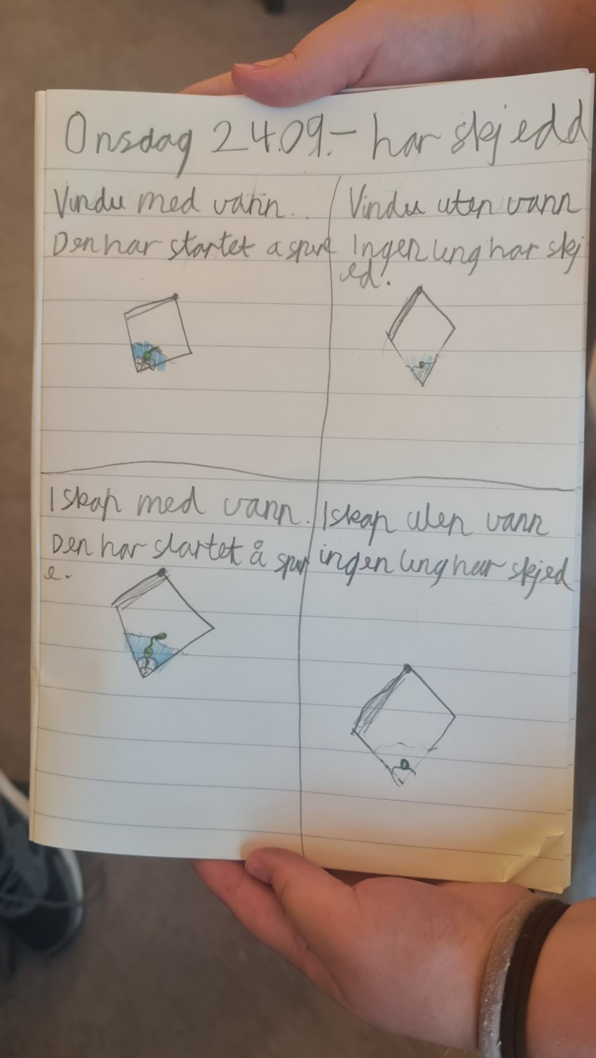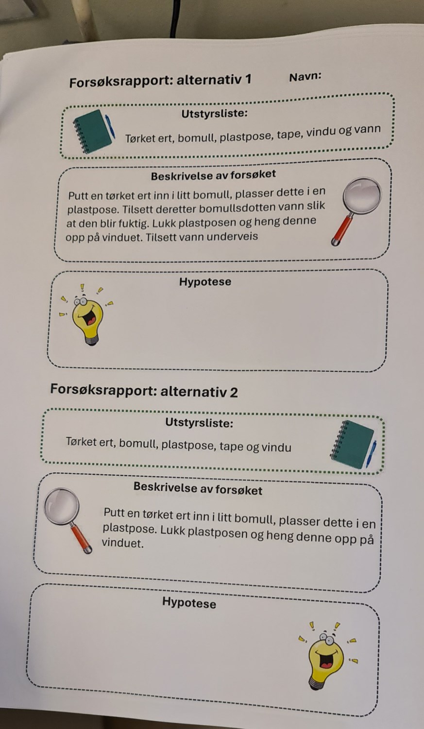 Vi gjorde forsøk med en tørket ert som ble lagt på en bomullsdott i en zippet plastpose; noen med lys og vann, lys uten vann, og i mørke med og uten vann. Vi lagde hypoteser og fulgte forsøket gjennom flere uker. Noen av hypotesene (hva vi trodde kom til å skje) stemte. Andre stemte ikke. Hva som skjer videre nå som spirene har blitt til planter som står i kopper med jord i både lys og mørke, gjenstår å se.