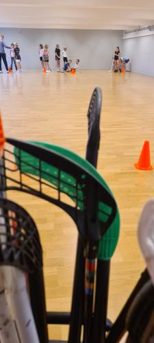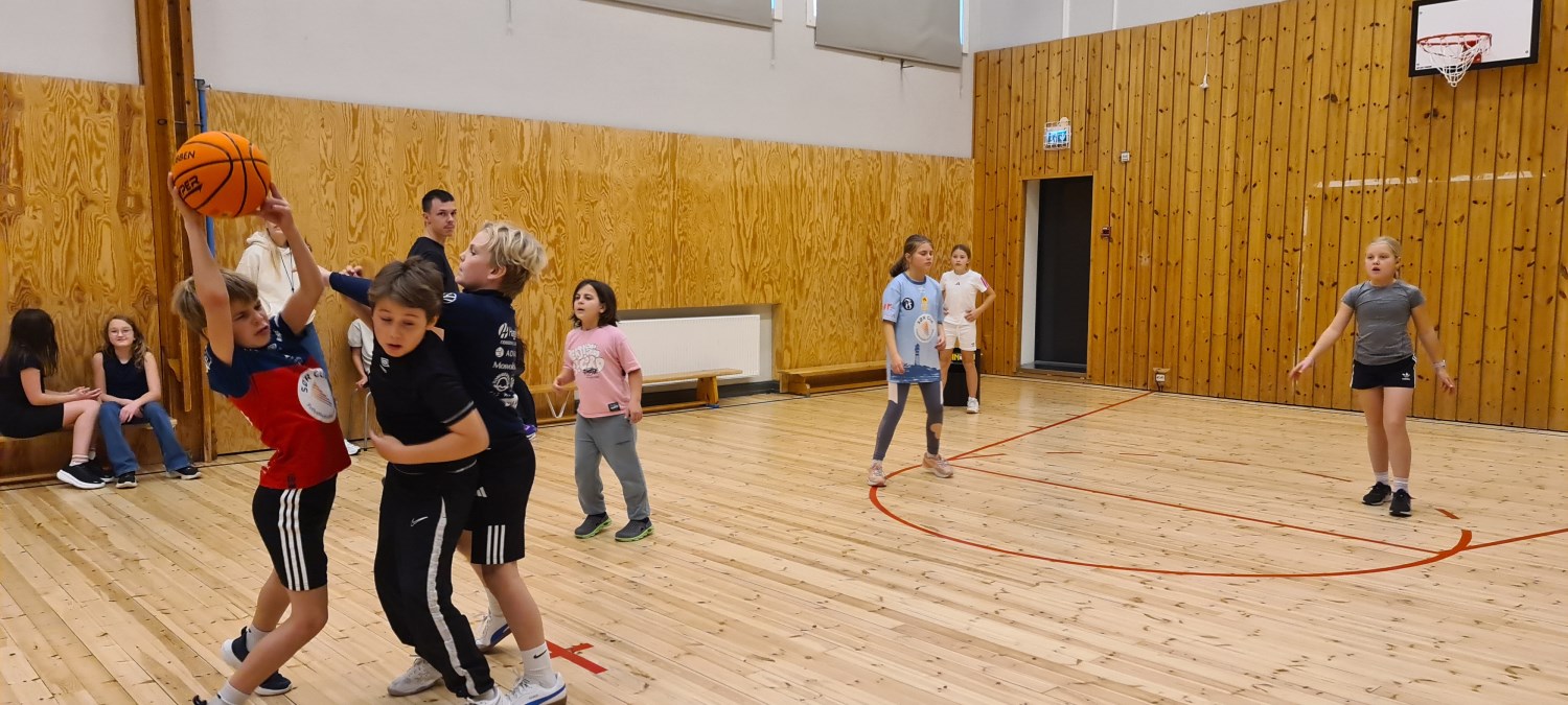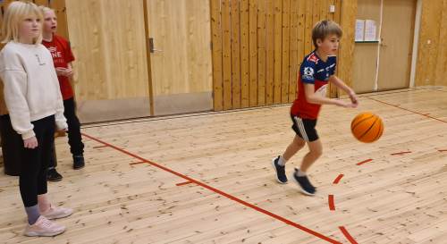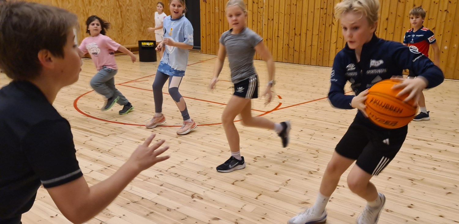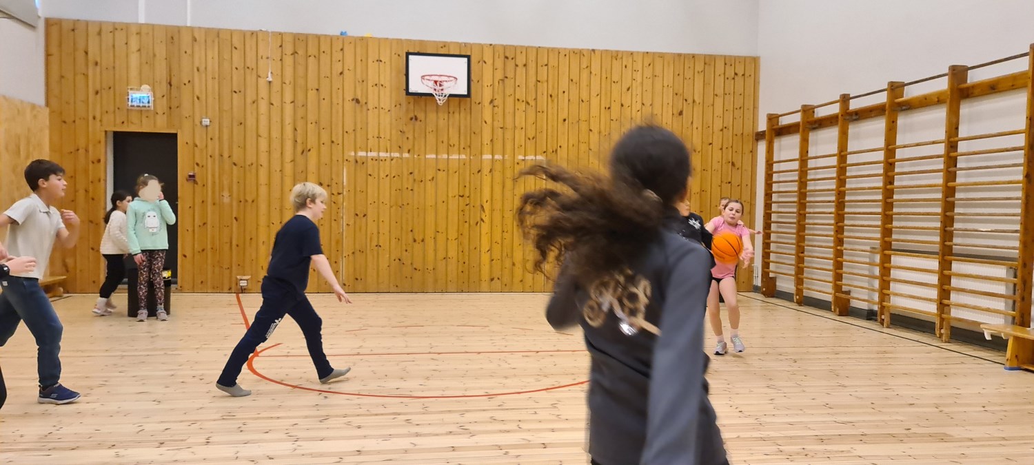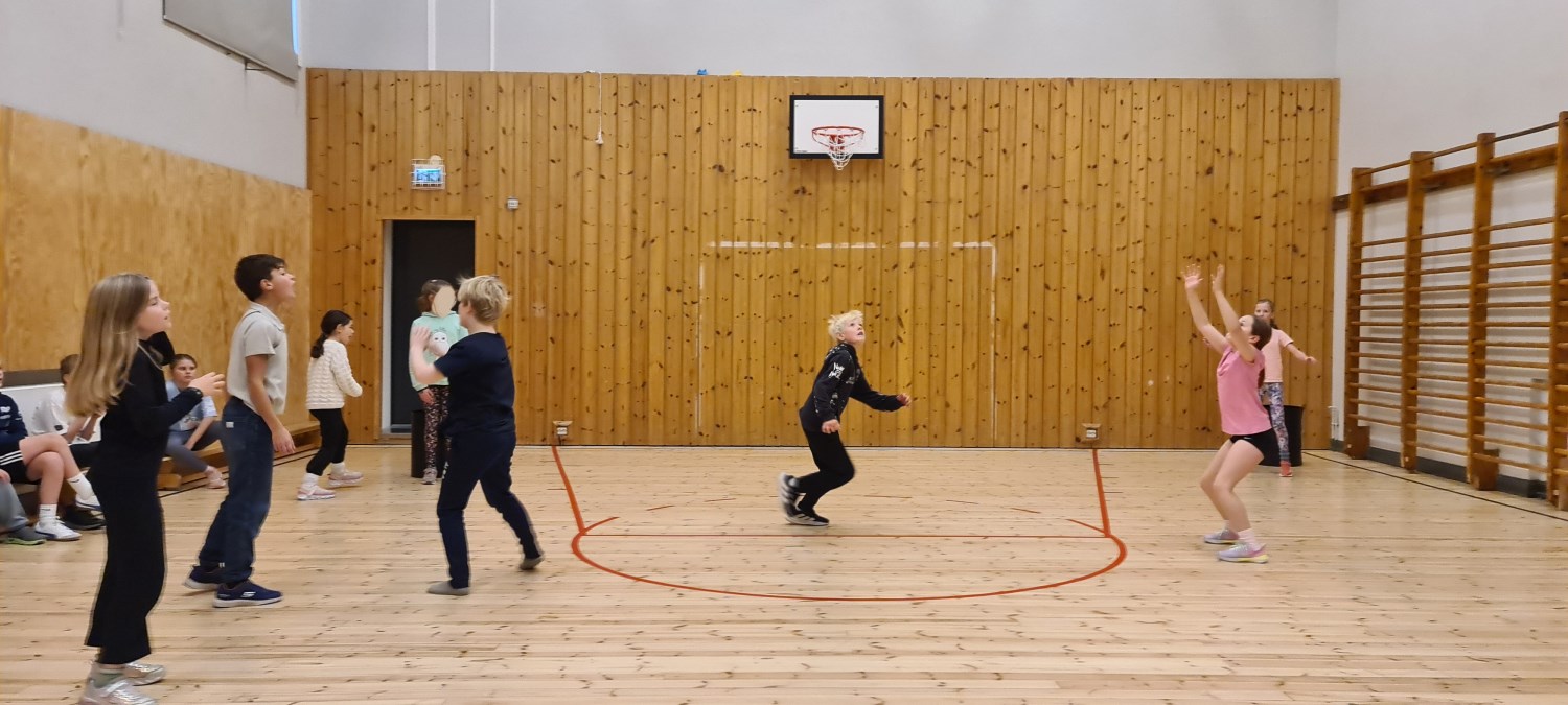 Iherdig innsats og høyt aktivitetsnivå med innebandy og basketball i kroppsøving.