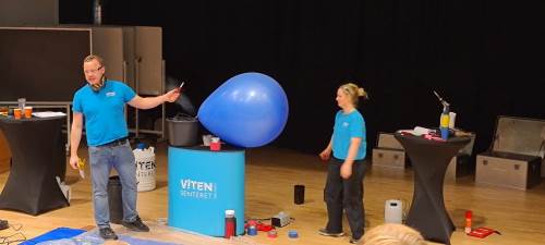 Vi startet med å se et forrykende vitenshow med kjemiske reaksjoner, eksplosjoner og røyk. Tre av jentene fikk nærkontakt; to på scenen og ei med kopp på hodet i setet. Imponerende!