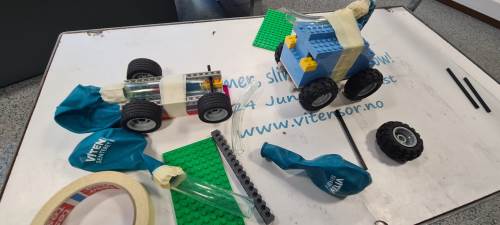 I lunsjen fikk vi frukt og brus, og noen tok seg en luftetur ut før bygging av en ballongbil av lego tok til. Målet var å få bilen til å bevege seg ved hjelp av kraften fra den oppblåste ballongen. Lettere sagt enn gjort, men de fleste bilene beveget seg litt i alle fall.