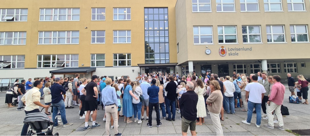 Spente førsteklassinger. Spente voksne. Ivrige og spente faddere. Flagget til topps. Første dag på Lovisenlund skole.