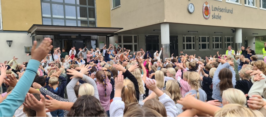 Presis kl. 12.00 ble alle med, danset og sang i skolegården på Lovisenlund i dag.