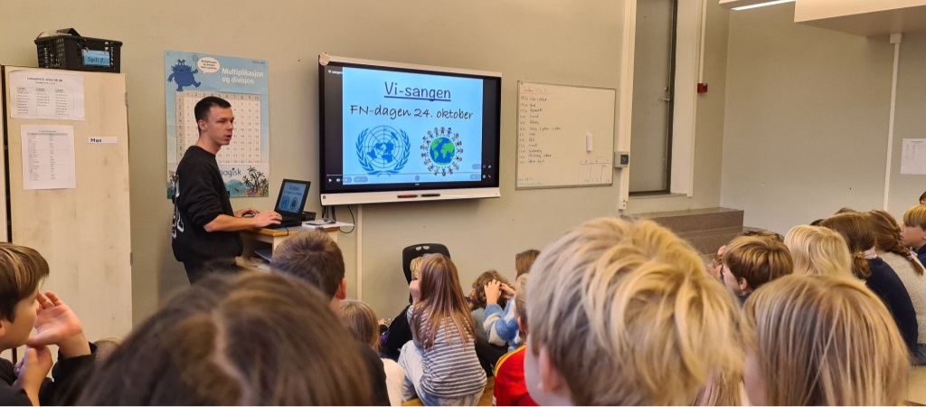 På Lova har 6. trinn ansvar for FN-samlingen for alle barn og voksne på skolen. I forkant øvde vi på tre sanger.