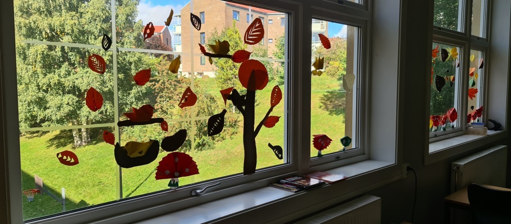 I kunst og håndverk har elevene dekorert vinduene i basen vår med høstløv, trestammer, fugler og gresskar.