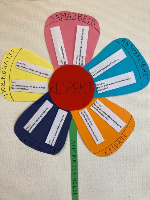 Hele skolen jobber med felles sosiale mål som endres hver måned. Målene er synlige i klasserommet og på ukeplanen. Disse målene har vi valgt å symbolisere gjennom en blomst som vi kaller respektblomsten. Denne henger i alle klasserom og på SFO.