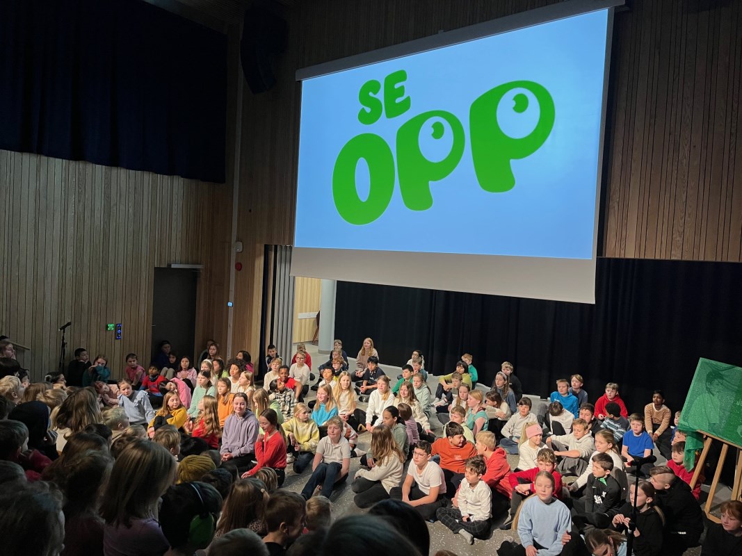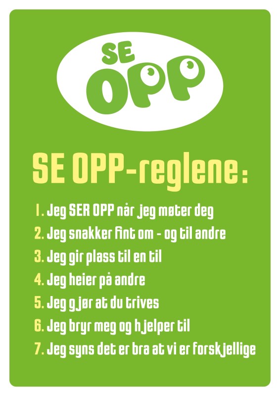Åtte ganger i året har vi SE OPP - dager på skolen vår. Da heises flagget før elevene kommer om morgenen. Vi har samlinger for hele skolen i vår flotte Aula. Vi har fokus på en av SE OPP-reglene. Sammen ser vi filmsnutter som handler om temaet. Det fineste av alt er at det alltid er ulike elevinnslag. Elevene synger, danser, dramatiserer og bidrar på andre måter for å belyse SE OPP - reglene. I klasserommet etterpå, prater vi om reglene og utfordrer fellesskapet på hva vi kan gjøre for at andre skal ha det bedre. Det individuelle ansvaret for hverandre er viktig!