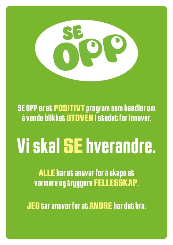 SE OPP er et positivt program som handler om å vende blikket utover i stedet for innover. Vi skal se hverandre. Alle har et ansvar for å skape et varmere og tryggere fellesskap. Jeg tar ansvar for at andre har det bra.