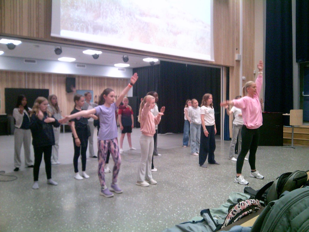 vi har snakket med to elever fra femte og syvende som begge to heter Sofie, de har sagt at de valgte dans fordi de liker å utfordre seg og å bevege seg. Dans er alltid gøy med masse jenter og det er det nå sier den elste Sofie og den yngste Sofie sa det blir gøy å vise frem showet.