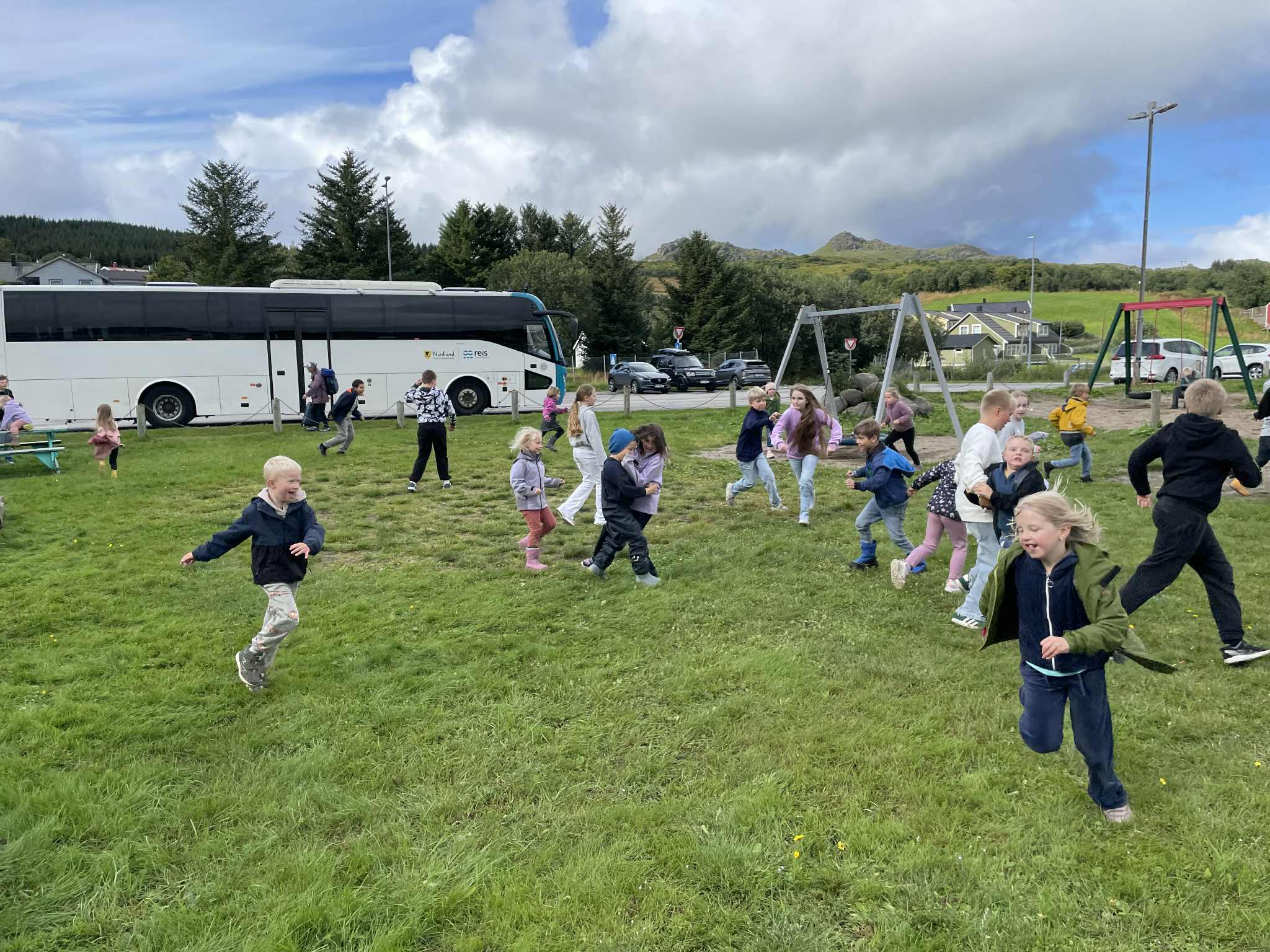 Å begynne på skolen er noe de fleste 6 åringer gleder seg til, men det kan være litt skummelt også. Da er det godt å ha noen store å støtte seg til. Her er 1. og 6. klasse i lek.