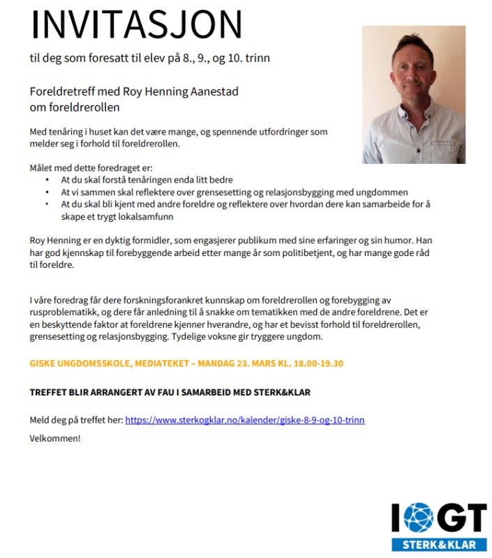 Foreldretreff med foredragsholder Roy Henning Aanestad om foreldrerollen i regi av FAU og Sterk&Klar Mandag 23.mars kl.18.