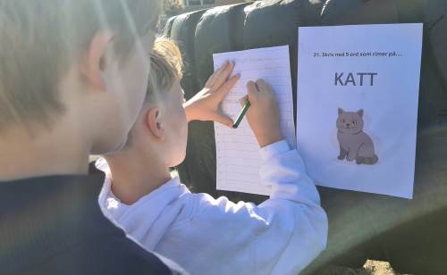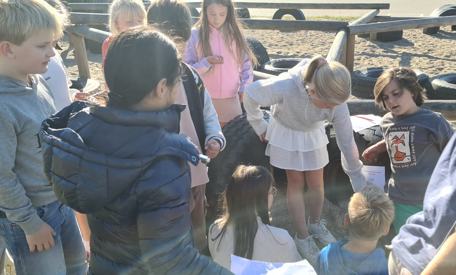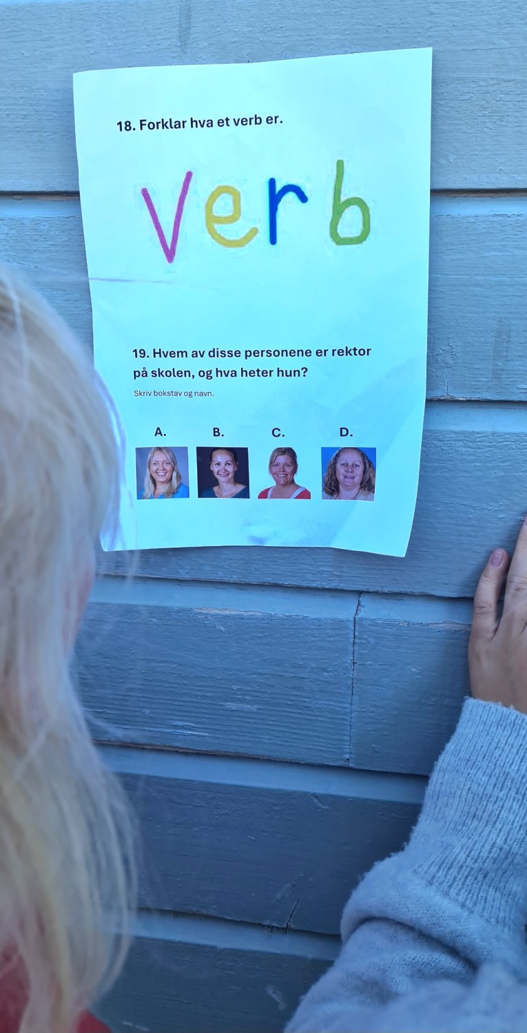 Torsdag gikk vi rundt i skolegården og fant poster med ulike spørsmål på som vi svarte på i mindre, samarbeidende grupper på tvers av trinnet