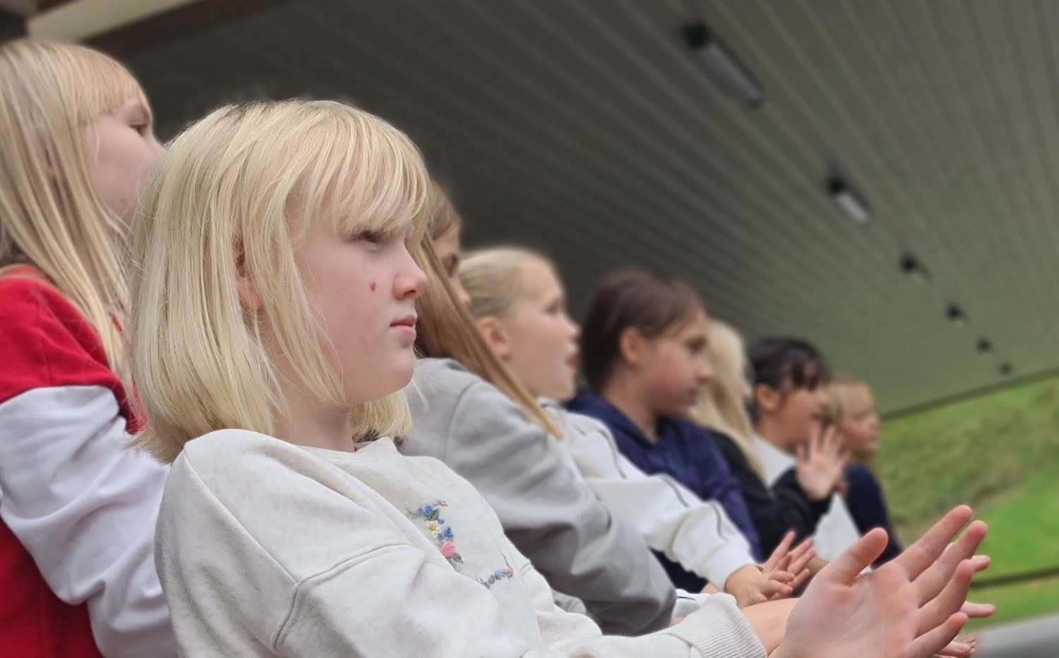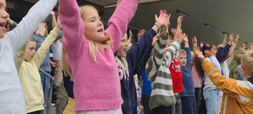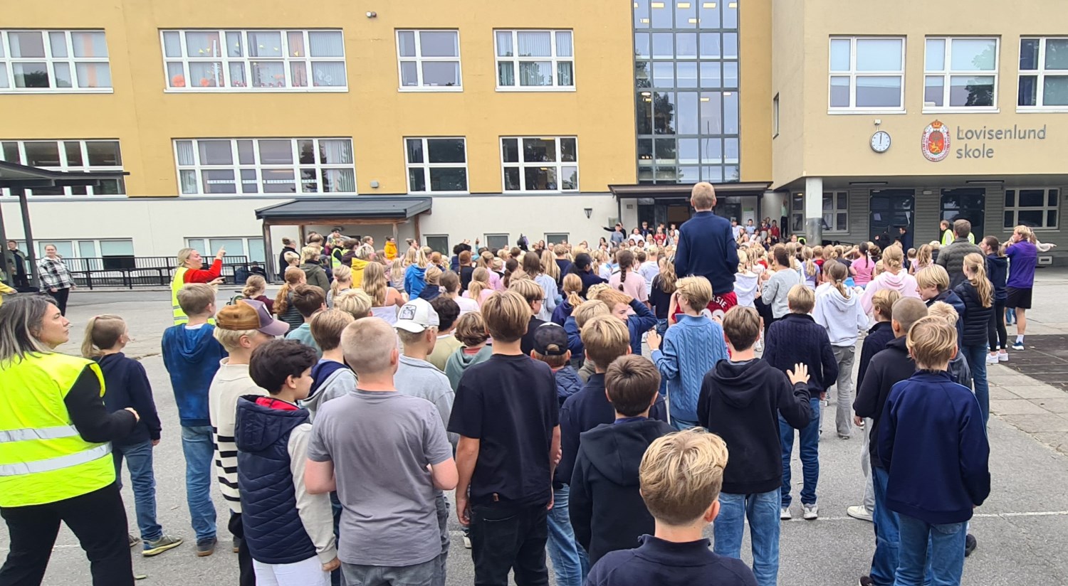 Presis kl. 12.00 ble alle med, danset og sang i skolegården på Lovisenlund i dag.