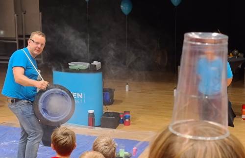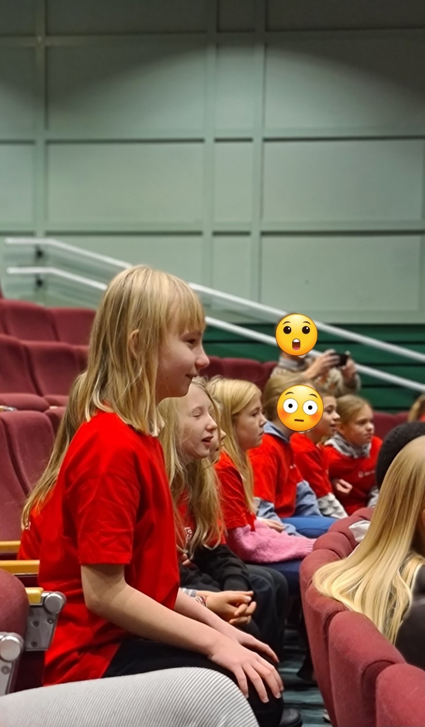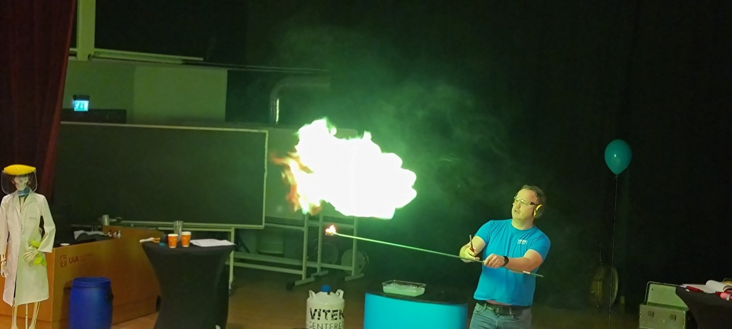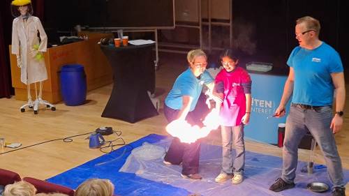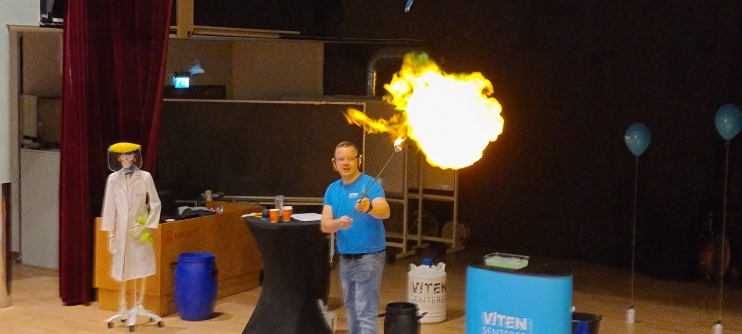 Vi startet med å se et forrykende vitenshow med kjemiske reaksjoner, eksplosjoner og røyk. Tre av jentene fikk nærkontakt; to på scenen og ei med kopp på hodet i setet. Imponerende!
