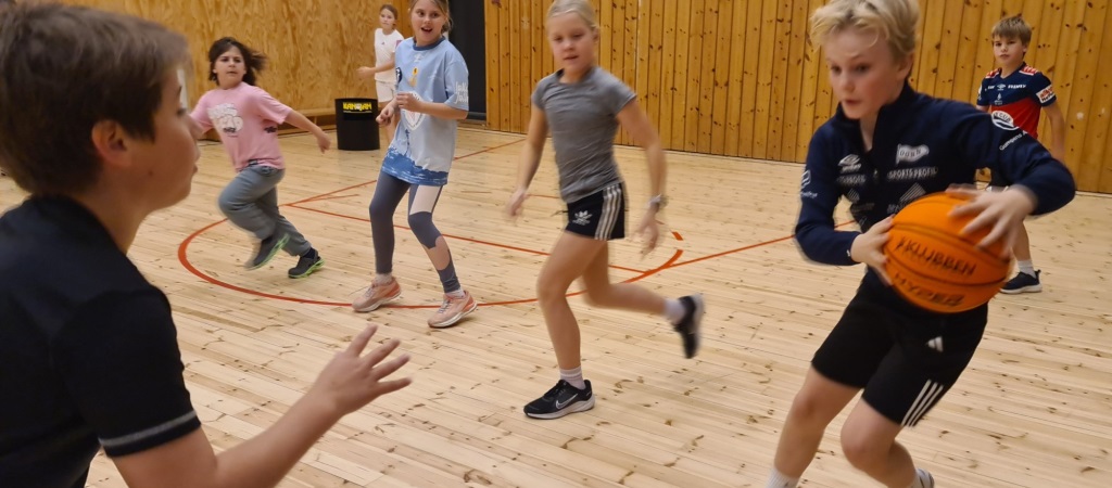 Iherdig innsats og høyt aktivitetsnivå med innebandy og basketball i kroppsøving.
