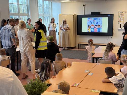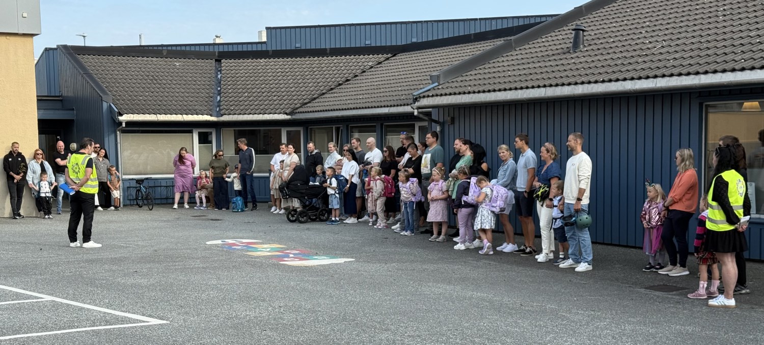 Norske flagg og raud laupar var klare til å ta i mot den fine gjengen som me er så heldige å får låna i sju heile år på Orre skule. Rektor ønska elevar og foreldre velkomne, og før me entra klasserommet fekk me foreviga eit bilete av dei skuleklare førsteklassingane som stråla med fine førsteklasse-klede og ny skulesekk.