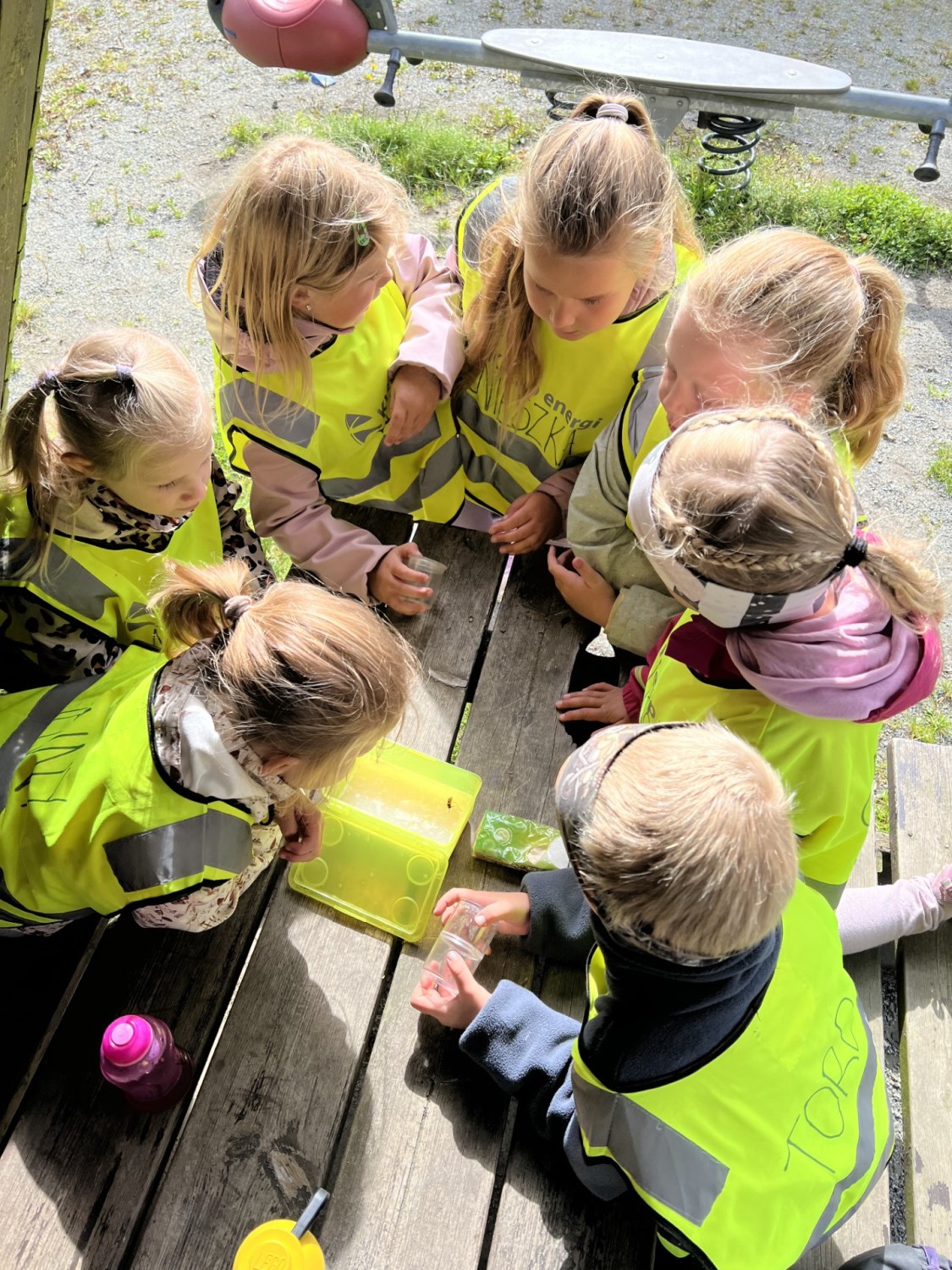 Me har også fått vore på tur med fjorårets 1.klassingar. Desse har no vorte stolte 2.klassingar, og har mykje god erfaring å gje dei nye elevane våre. Dei to førre onsdagane har me øva oss på å vera gode trafikantar og har gått på fine tur - rekkjer til friområdet. Der har me blant anna laga kvepsefeller med gjær, sukker, vatn og zalo. Me måtte testa det ut heile to gonger, og siste gong vart det brak-suksess med mange kvepsar i fellene.