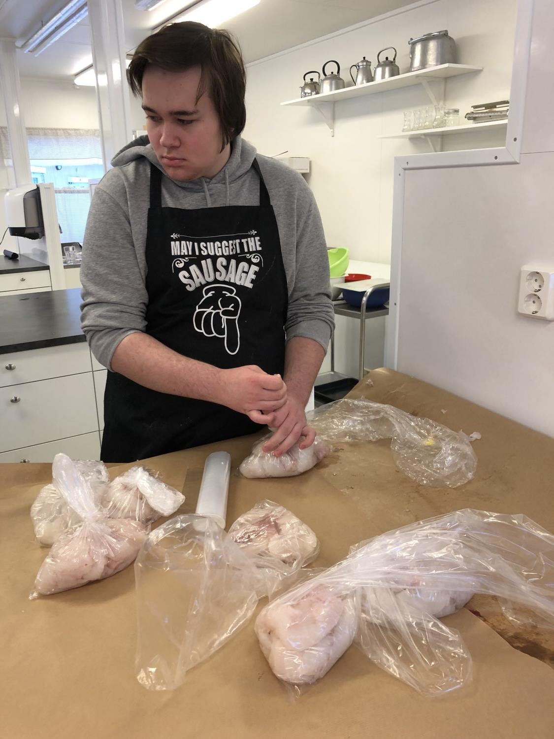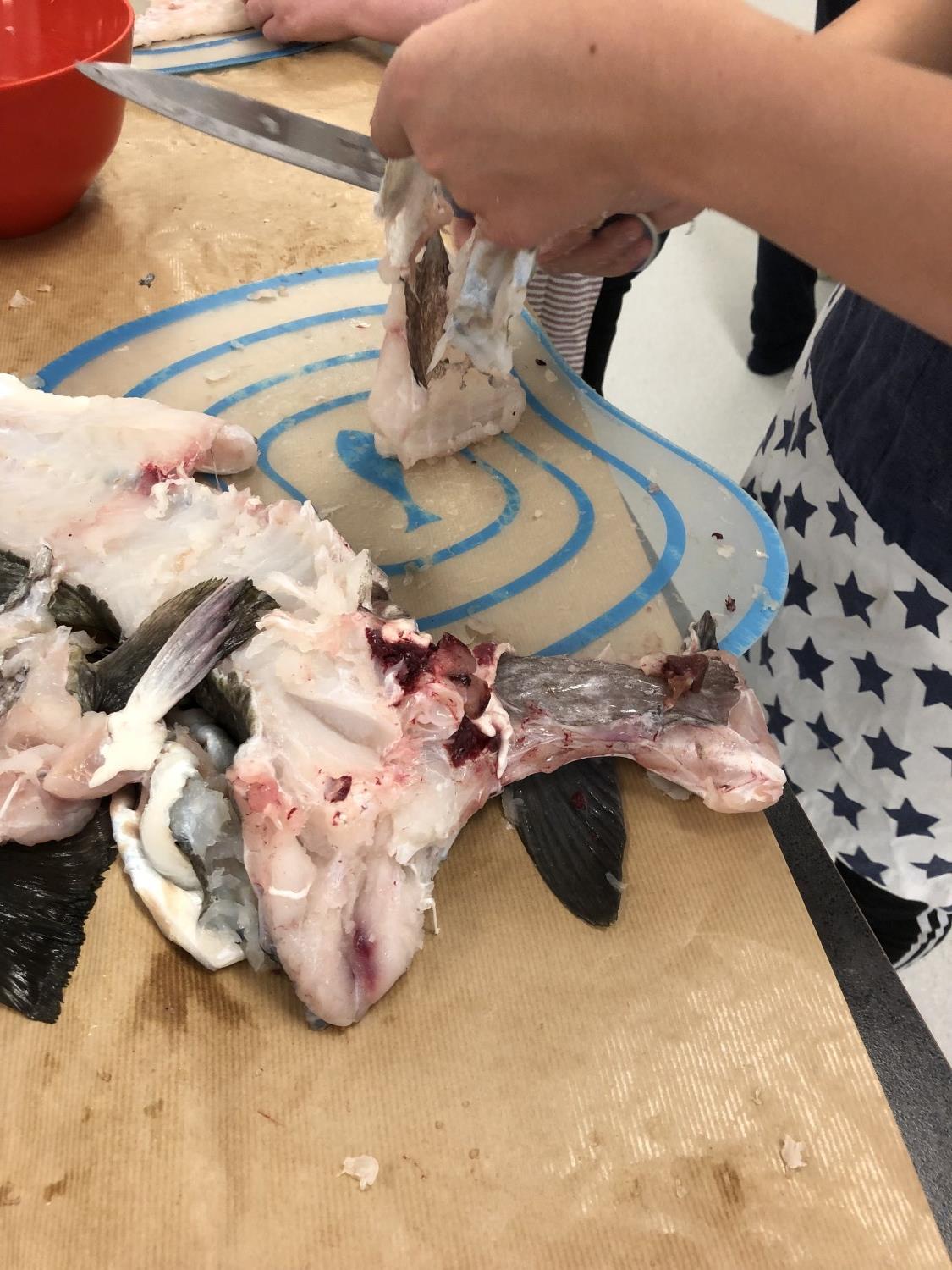 Klassen startet med å pakke inn rognene i matpapir og klargjorde kasseroller til koking av rogna. Så skar elevene både filet og fiskestykker til koking. Poteter ble kokt og gulerøtter rensket og kokt. Vi hadde masse fisk, nok til både ferskfisk, filet og småbiter til fiskekaker.