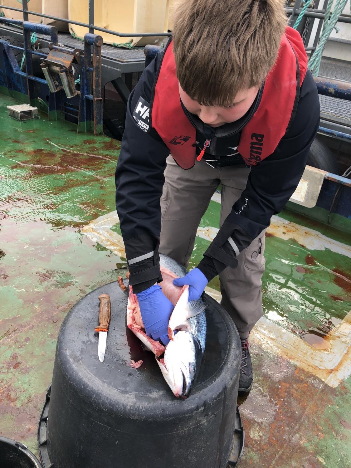 Etter denne læringsseansen, fikk elevene selv prøve å sløye både laks, torsk og sei. De fikk være med på å skjære filet av torsk og laks. Dette viste Kato oss. Kato skjærte flere fileter til elevene som de fikk ta med seg tilbake til skolen, for å bruke i matlaging. Allerede neste dag var hele skolen i kystfortet og der lagde elevene seg laksepakker med torsk i, over bål. De hadde fisk sammen med grønnsaker i folie og stekte det over bålet. I neste uke lagde elevene fiskesuppe med både laks og torsk.