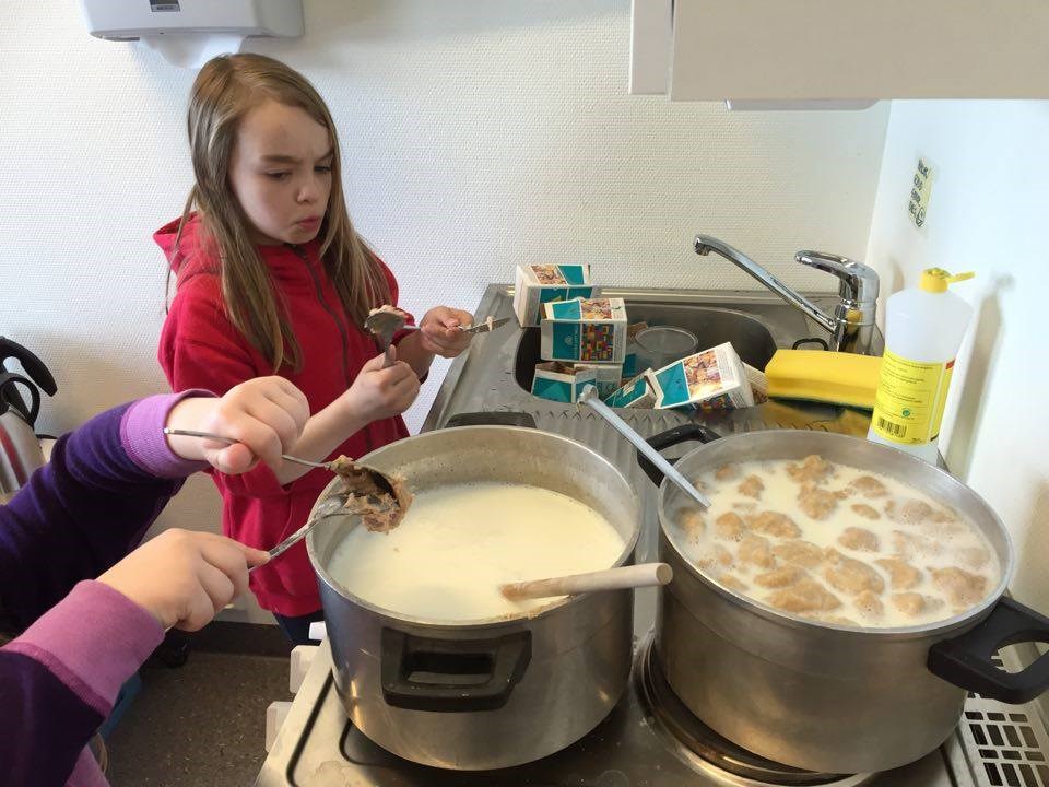Elevene i 3. og 4.trinn har arbeidet med vannets egenskaper og sett hvordan vann opptrer i de ulike formene det kan være i. De har frosset vann og sett hvordan det utvider seg i volum og kokt vann for å studere dampen, som igjen blir til vann. I den forbindelse var det interessant å se om melk hadde de samme egenskapene. Vi bestemte oss for å se på hva som skjedde når vi blandet ulike stoffer sammen og endte opp med at vi ville lage kleppmelk. Da fikk de se hvordan vi blandet tørre stoffer sammen med væske, og hva varmebehandling gjorde med dette. De fikk se ulike kjemiske reaksjoner. De lurte på om dampen fra melka, ble til melk igjen, og oppdaget fort at det var vanndamp. Hele prosessen gav flotte diskusjoner og refleksjoner over stoffenes egenskaper. Og kleppmelken, den ble ekstra god!