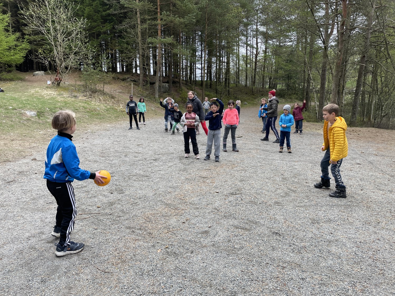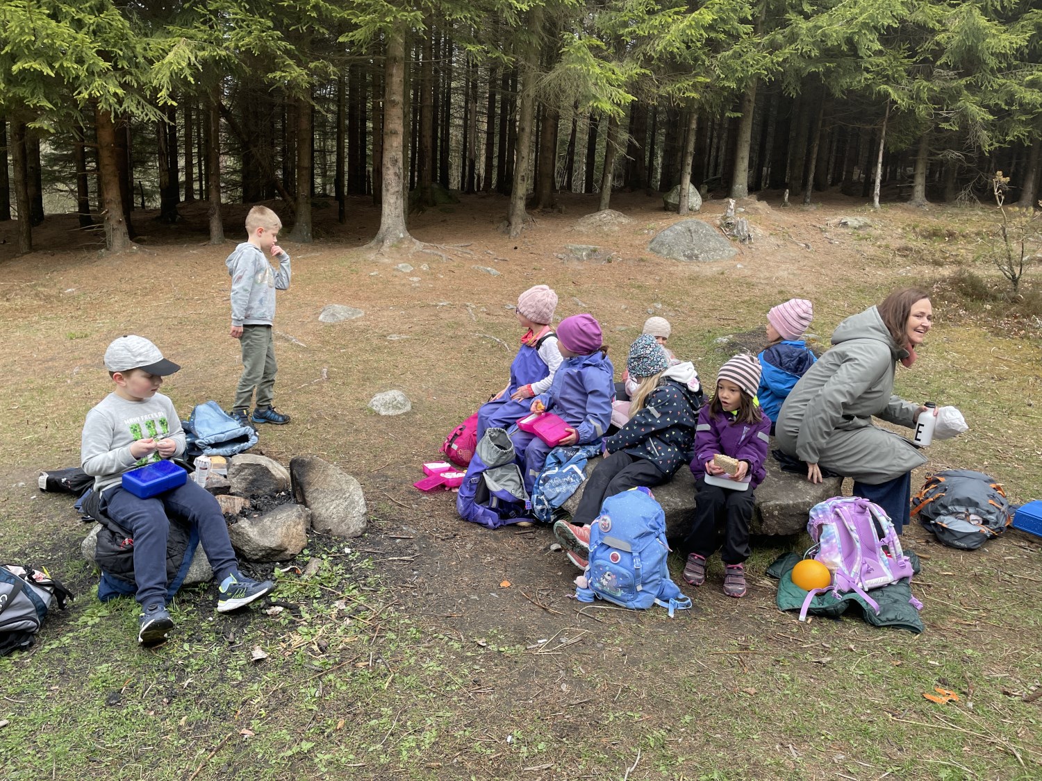 Andre klasse var med oss. Og guttene i andre klassene lurte oss med at det var en bjørn og en elg i skogen.