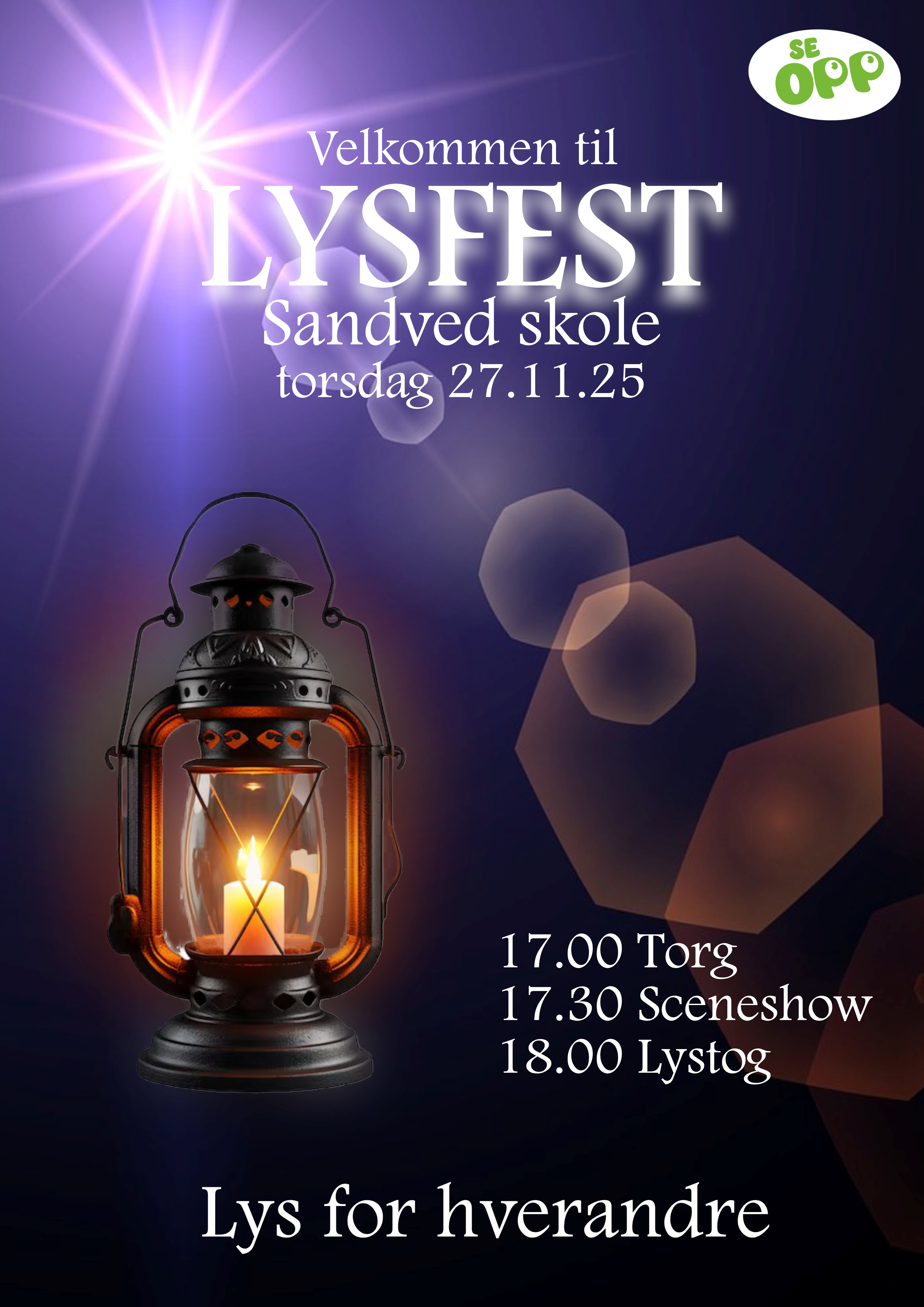 Torsdag 27. november er det igjen klart for Lysfest på Sandved skole. Tittelen for arrangementet er «Lys for hverandre». Fjorårets Lysfest ble en flott opplevelse for store og små, og vi satser på at det blir en minst like stor suksess i år.