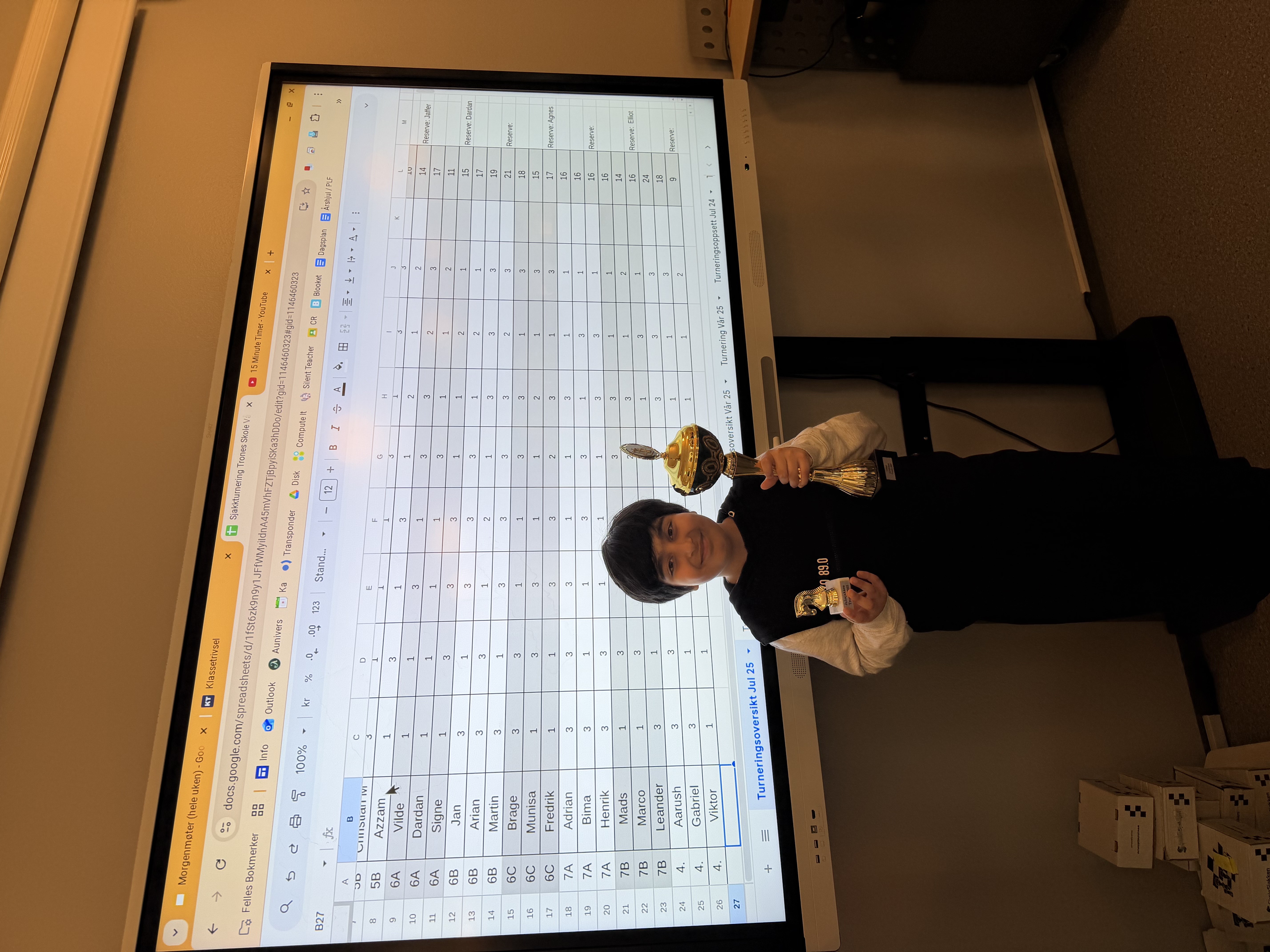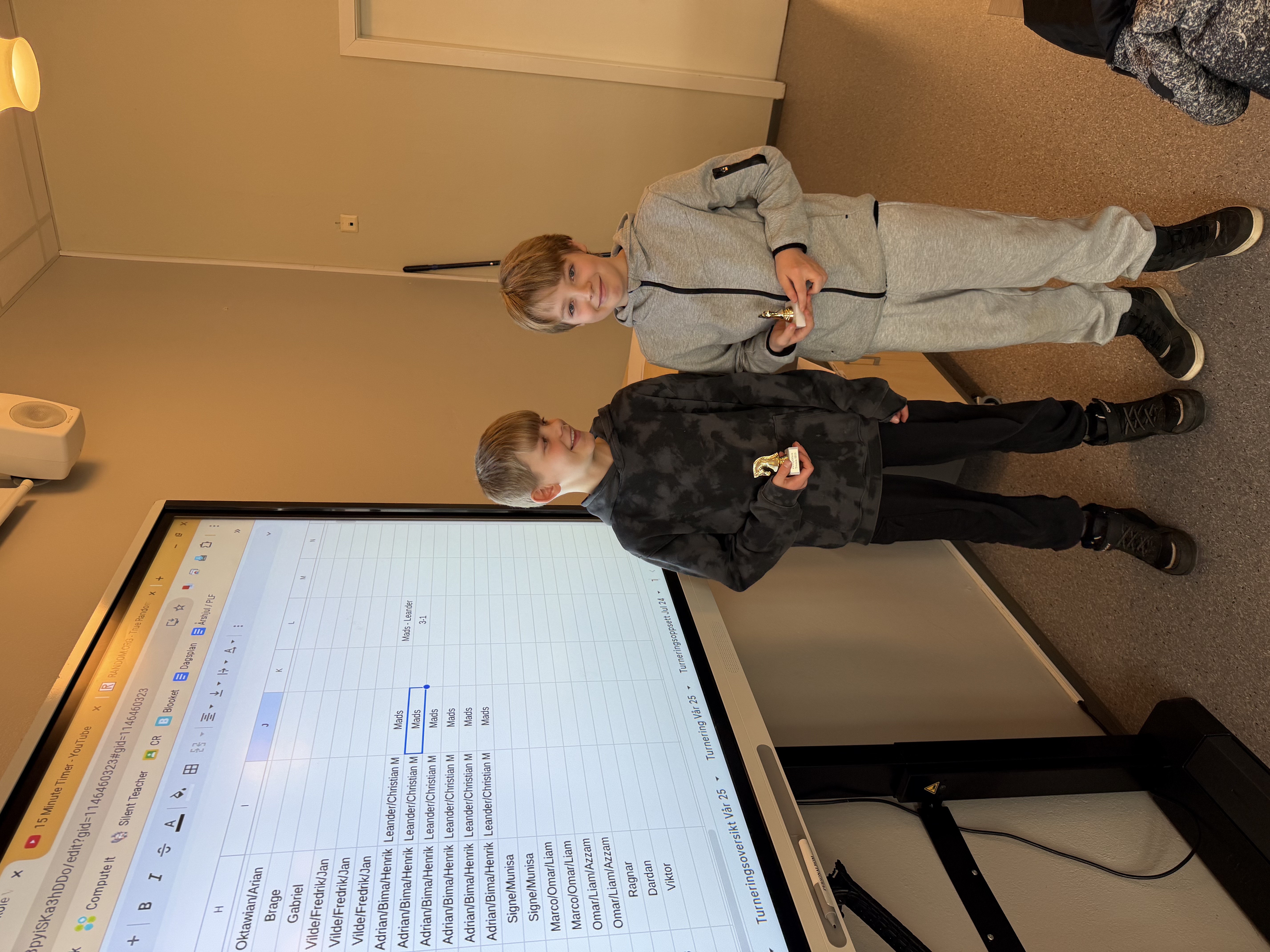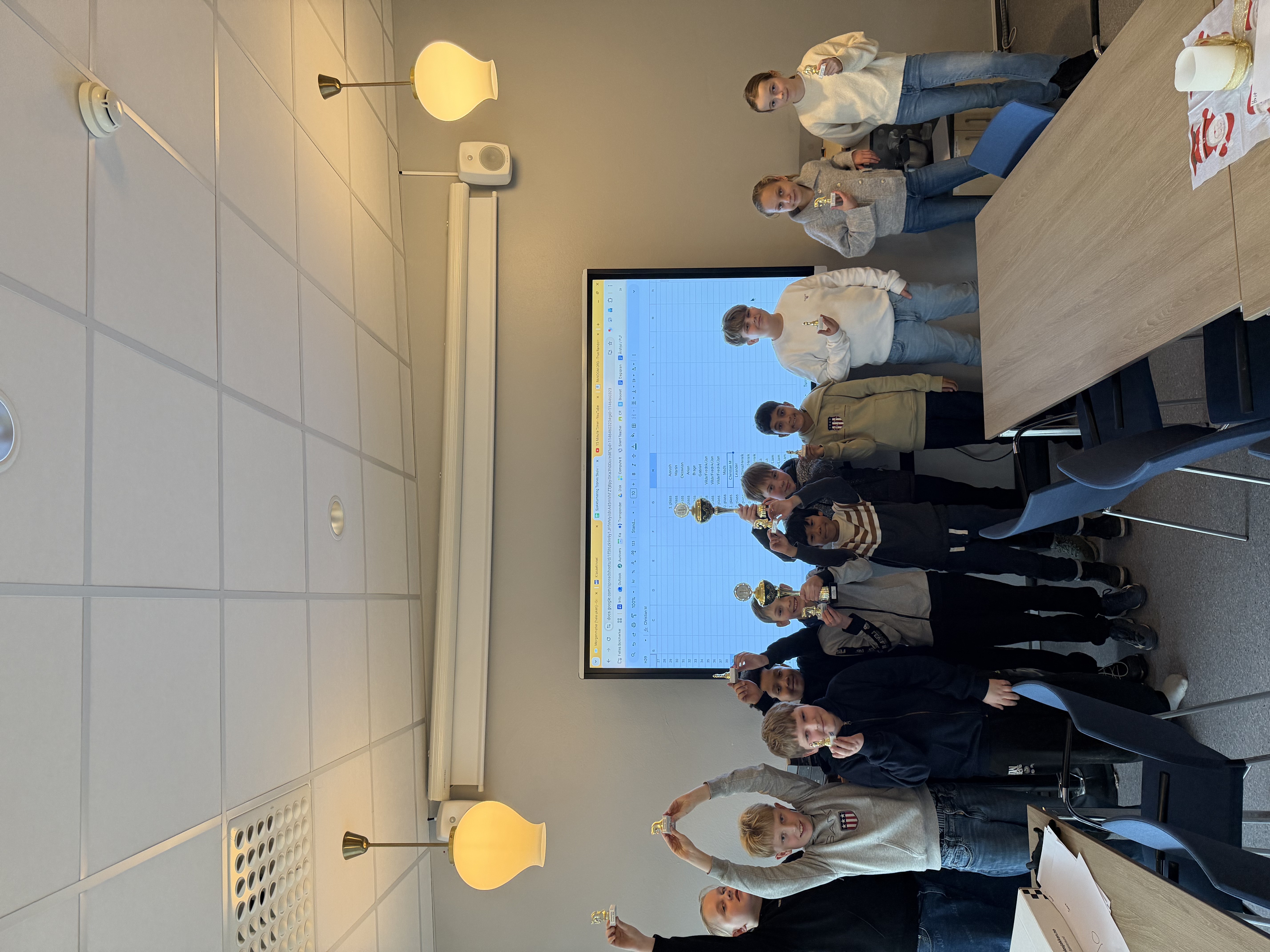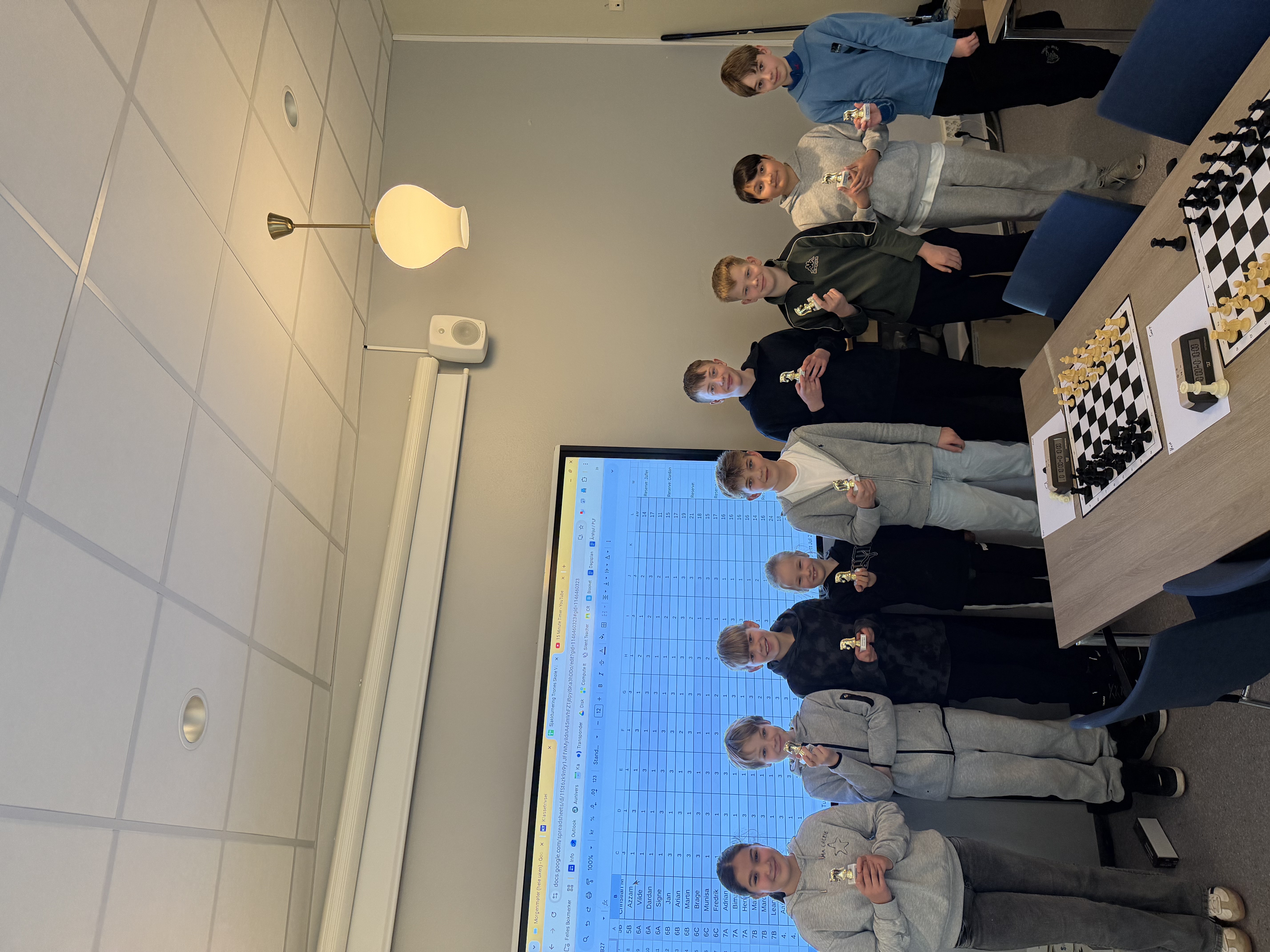 24 spente elever møtte opp på personalrommet 08:15 på morgenen klare for turnering. Etter 8 spilte partier hadde vi en soleklar 1. og 2. plass, og 3. plassen ble avgjort på tie-breaker.